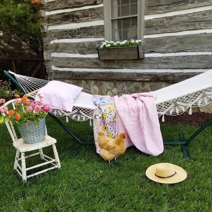an inviting hammock with fluffy laced pillows along with classical music playing in my ear